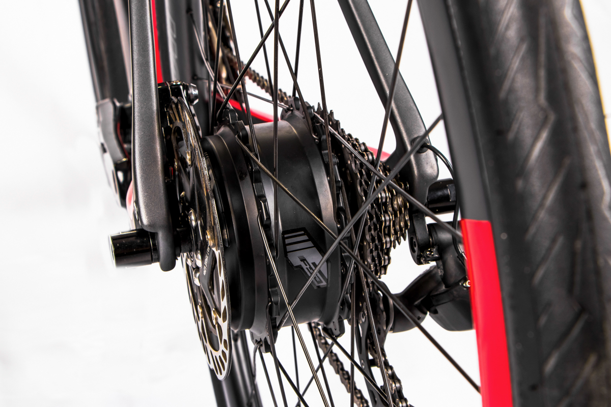 Spostandoci invece sul lato dei componenti, la Ducati futa monta un motore posto sul mozzo della ruota posteriore, l’FSA System HM 1.0 con 250 W di potenza e 42 Nm di coppia massima. Il peso è inferiore ai 4 kg (3,98 per la precisione, 12,4 kg è il peso della bici completa), cifra che comprende anche la batteria, da 250 Wh, integrata nel tubo obliquo e compatibile con un range extender opzionale (incluso nella versione Limited Edition, che comprende anche il ciclocomputer Garmin Edge Explore) che raddoppia la capacità complessiva.