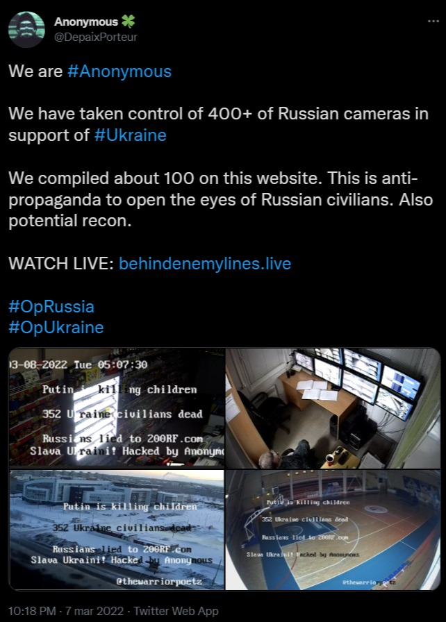 Sempre nel tentativo di informare la popolazione russa, è stato messo in atto un attacco a oltre 400 webcam sparse per tutto il paese, gli autori thewarriorpoetz e depaixporteur hacker auto dichiaratisi membri del collettivo, sono riusciti a prendere il controllo dei dispositivi e a trasmettere sulle schermate visualizzate, informazioni e messaggi riguardanti la situazione in Ucraina. Sono state escluse, per privacy nei confronti dei cittadini, le webcam delle abitazioni private, tutte le altre trasmettono da negozi, scuole, uffici e luoghi pubblici e nelle ultime ore, oltre alle immagini riprese, proiettano in diretta messaggi rivolti ai cittadini russi come ad esempio “Putin sta uccidendo bambini. Almeno 352 civili ucraini sono morti“.