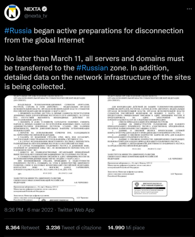 L’account di Nexta TV ha pubblicato su Twitter due pagine di documenti, nelle quali sembra sia riportato il piano del governo di Putin, ovvero trasferire tutti i server e i domini dei siti web russi in Runet, una sorta di rete internet nazionale; inoltre sembra si stiano raccogliendo informazioni riguardanti l’infrastruttura di rete dei siti.