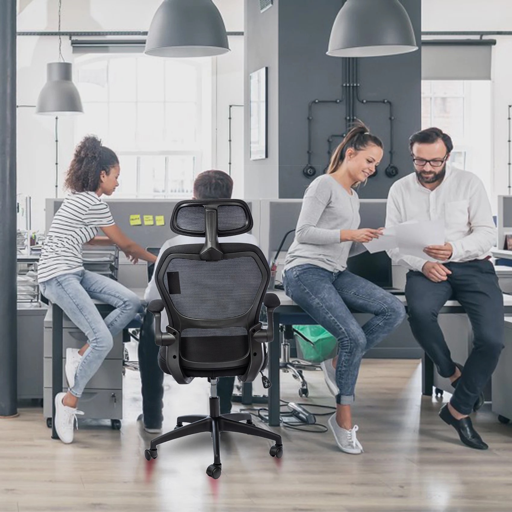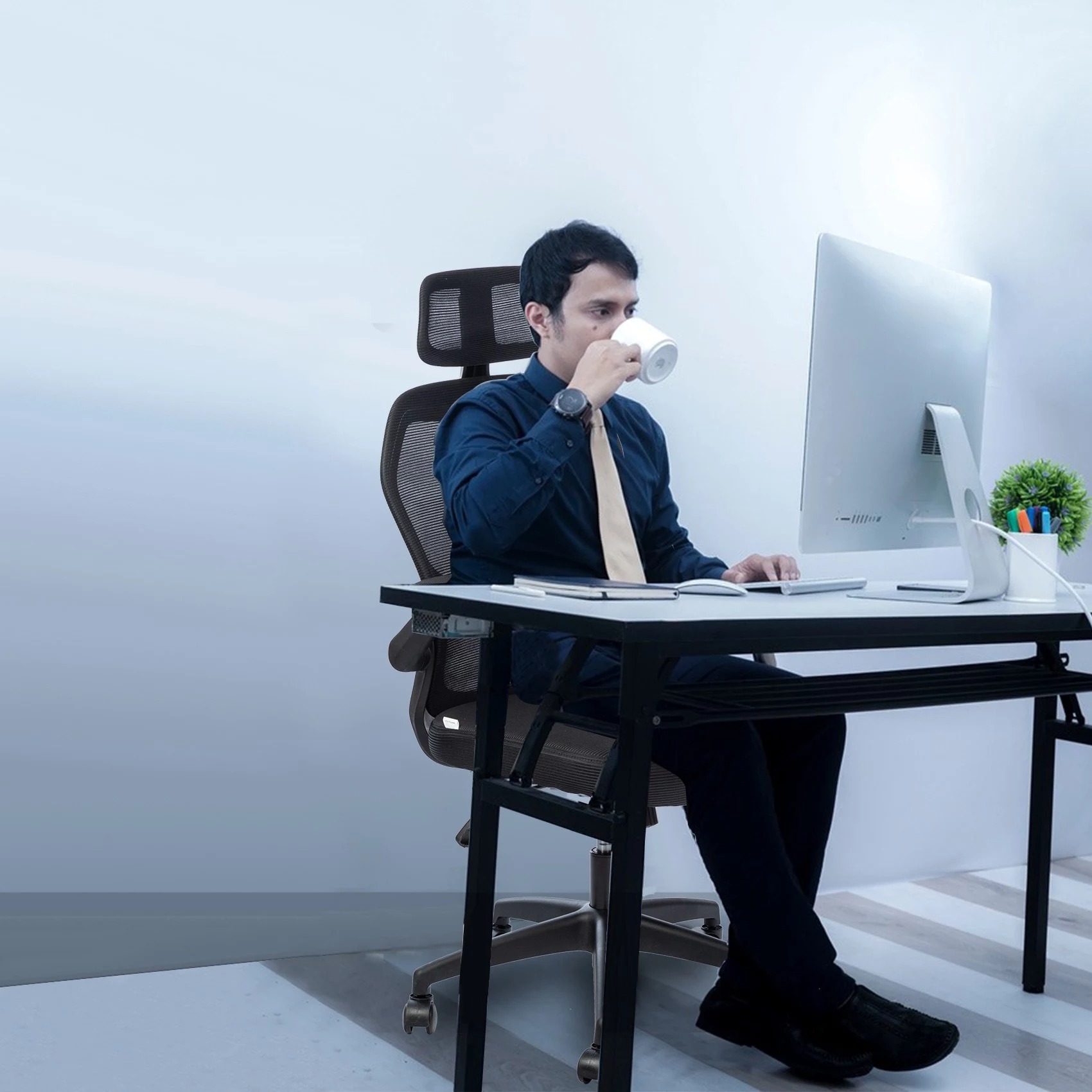 Lo schienale si reclina fino a 107 gradi ma è possibile mantenerlo bloccato a 90 gradi per adattarsi alle esigenze di ogni singolo utilizzatore. Le cinque ruote permettono un facile movimento in ogni direzione e il poggiatesta regolabile in altezza offre un valido sostegno durante le giornate di lavoro.