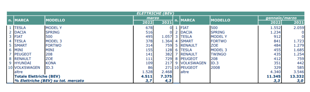 La tabella qui di sotto ci riassume le elettriche più vendute in Italia a marzo e al termine del primo trimestre del 2022.