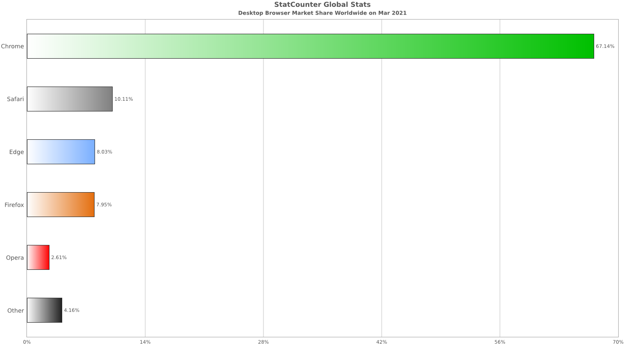 Considerando, invece, le quote di mercato dei browser più usati a livello globale su tutte le piattaforme, non solo desktop, cambia leggermente la musica. Anche in questo caso, siamo andati a confrontare i dati di marzo 2022 con quelli di marzo 2021.