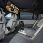 Ma il bello è riservato a chi siede dietro. Si trova qui il cinema privato cui accennavamo, uno schermo touch 8K da ben 31,3 pollici di diametro con rapporto di forma cinematografico, chiaro, che oltre a essere compatibile con le Fire TV, con Amazon Prime Video, permette anche di giocare, coccolati dall’impianto audio dedicato Bowers & Wilkins con 36 altoparlanti ed effetti 4D.