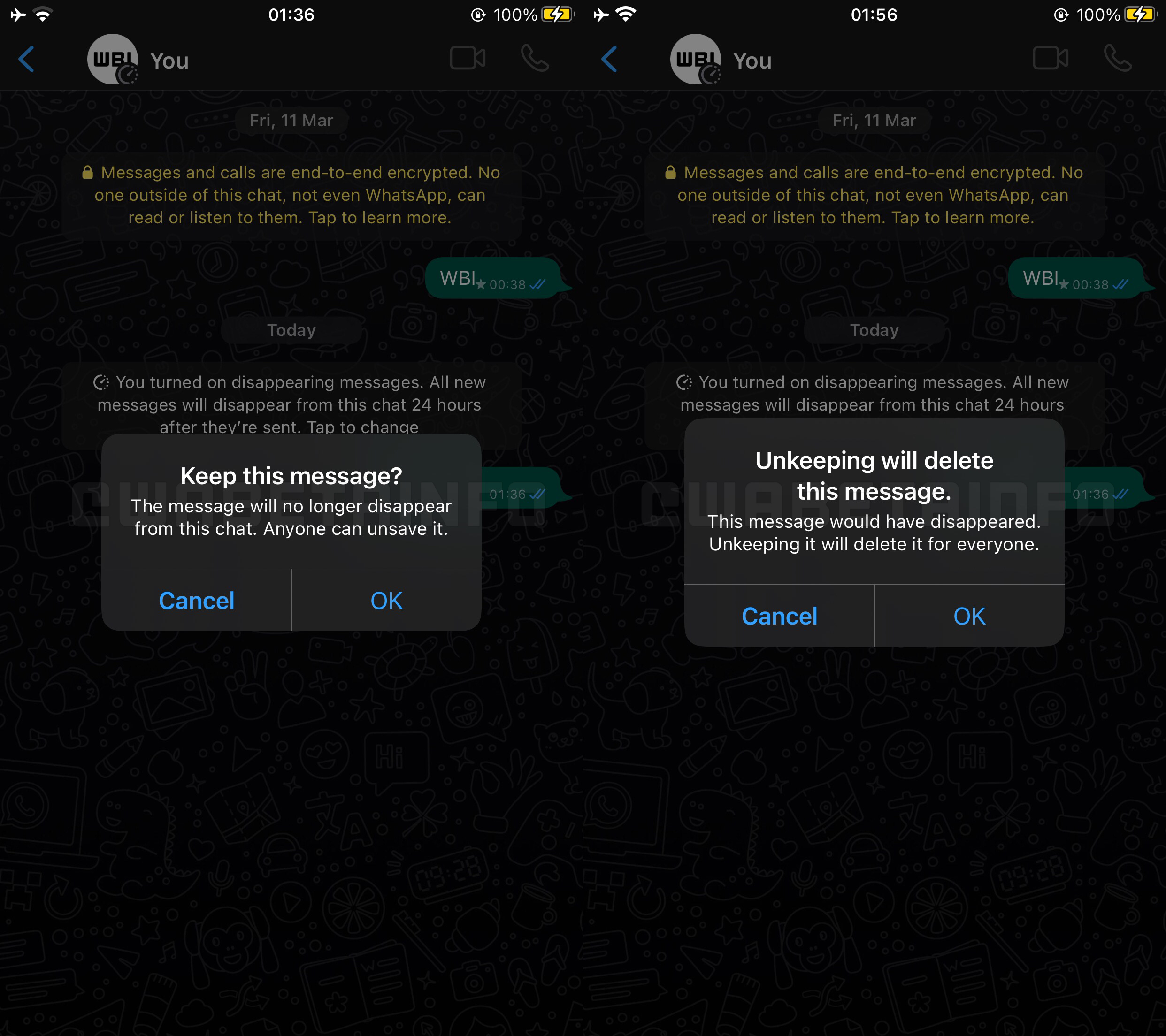 Nello specifico, è stata scovata la possibilità di intervenire sui messaggi effimeri: gli utenti potranno presto decidere di mantenere un messaggio effimero, trasformandolo in messaggio “normale” e svincolandolo dal timer di cancellazione impostato per la chat; al contempo, chiunque all’interno della chat potrà effettuare l’operazione inversa, ri-trasformandolo in un messaggio effimero e ri-vincolando la sua sopravvivenza al timer impostato nella chat.