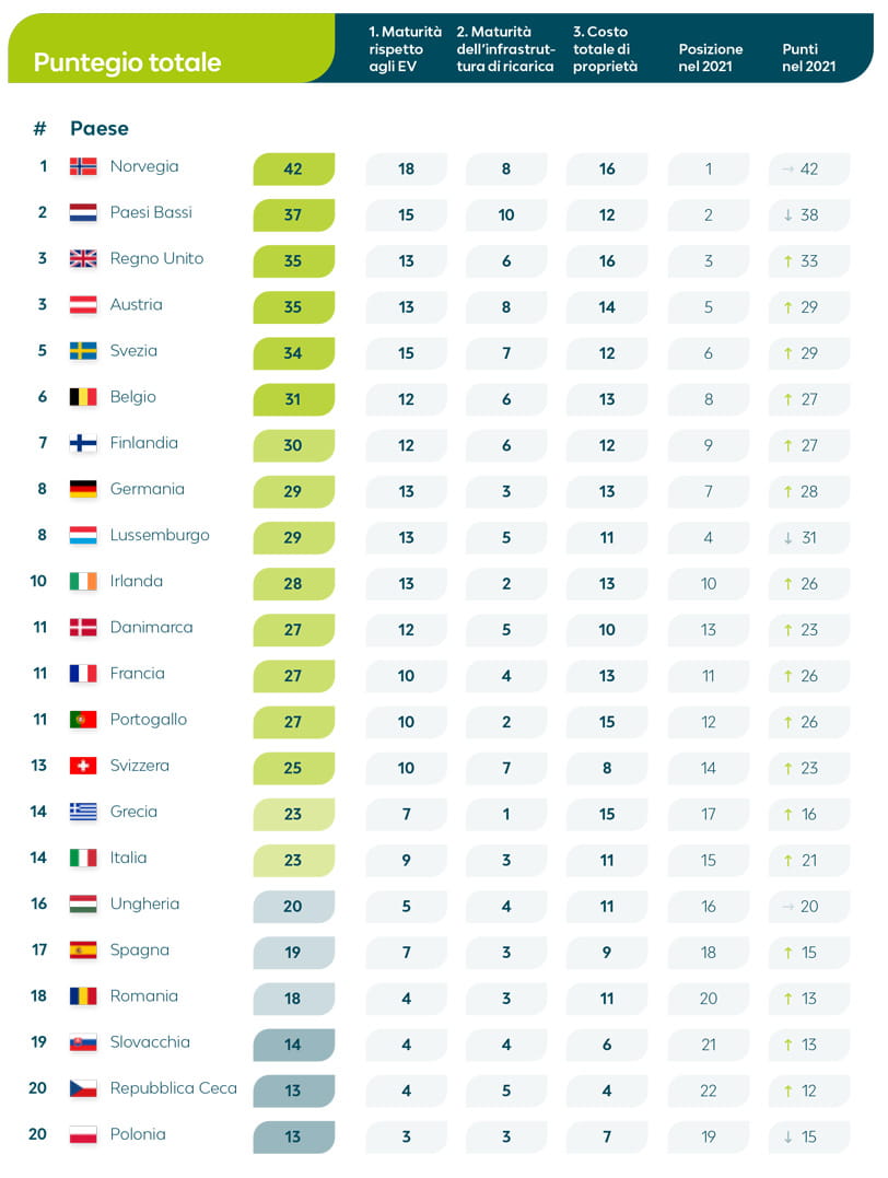Guardando la classifica la Norvegia si posiziona al primo posto in termini di supporto alla mobilità elettrica, mentre la Repubblica Ceca e la Polonia si sono classificate agli ultimi posti. La Grecia presenta il punteggio con il miglioramento più significativo rispetto al 2021.