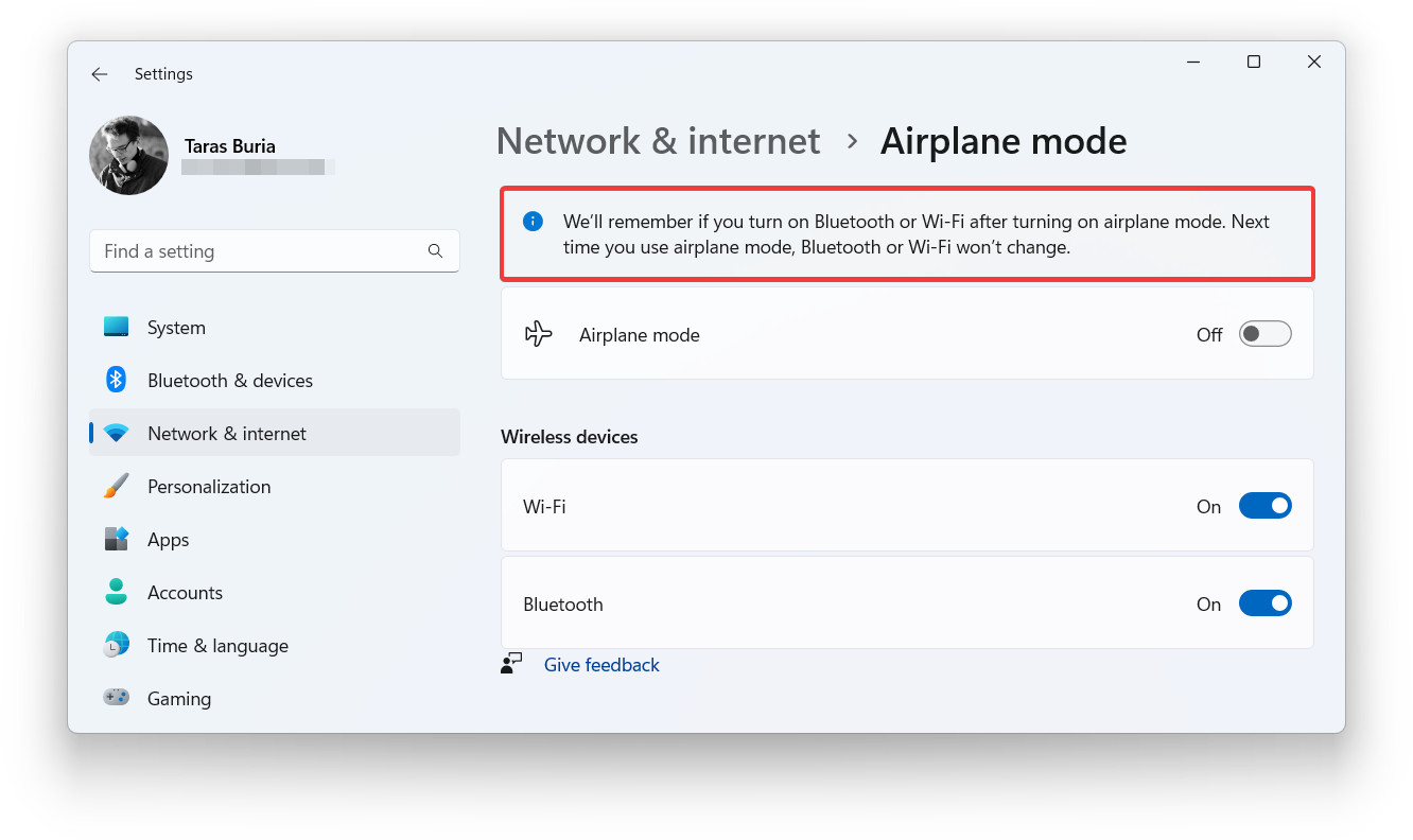 In Modalità aereo, Windows ricorda l’eventuale attivazione di Wi-Fi e Bluetooth da parte dell’utente, per comportarsi analogamente al successivo utilizzo della modalità.