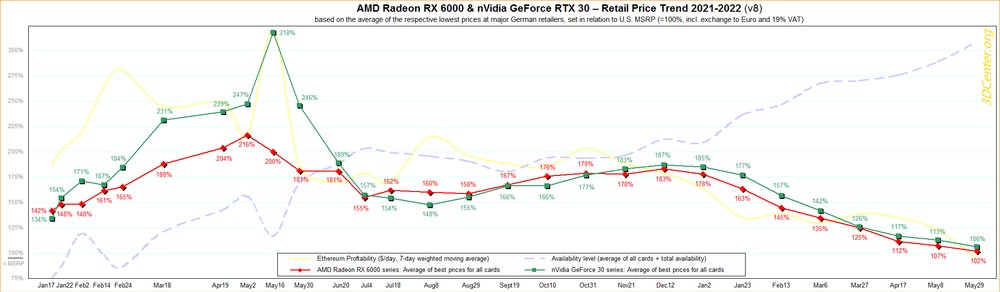 Dopo mesi alle stelle, a causa della pandemia, della conseguente crisi dei chip e del fenomeno delle criptovalute, secondo l’ultima analisi di 3DCenter i prezzi delle schede video stanno tornando a livelli di quasi normalità, allineandosi ai prezzi di listino.