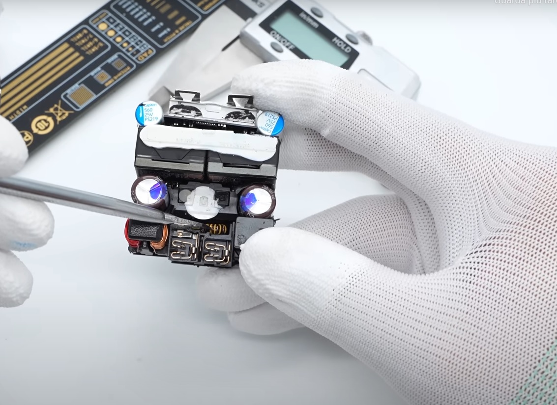 Il video di ChargerLab evidenzia che l’adattatore utilizza delle clip per fissare il modulo PCB, oltre a una sezione personalizzata nella parte superiore per tenerlo in posizione, inoltre è presente anche un pad termico che aiuta a raffreddare il prodotto sotto carico.