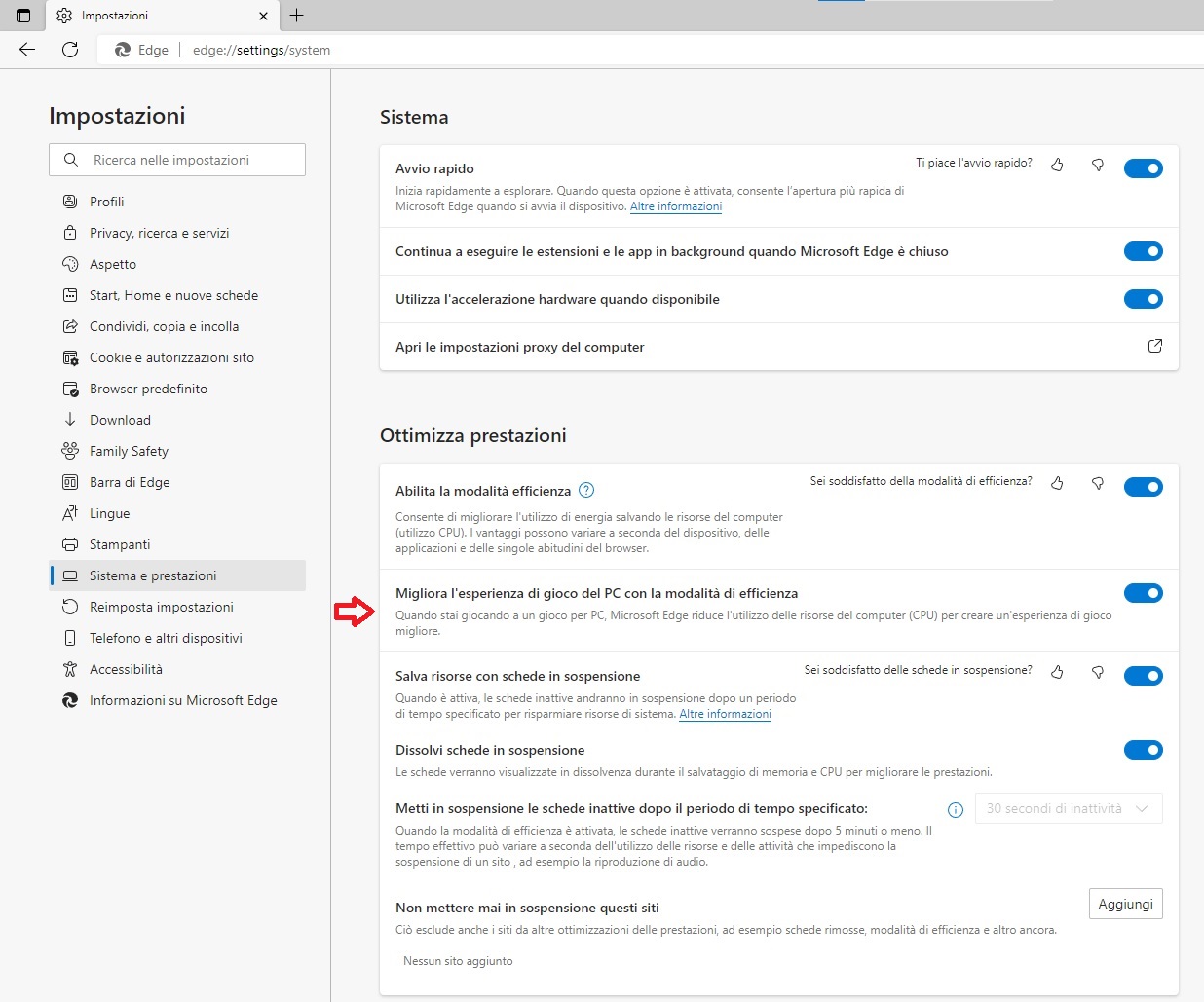 Abilitando la nuova opzione per la modalità efficienza disponibile per Windows 10 e Windows 11 non è necessario chiudere il browser per giocare e riaprirlo al termine della sessione. Non appena l’utente chiude il gioco, Edge esce automaticamente dalla modalità Efficienza, come spiegato da Liat Ben-Zur di Microsoft. La nuova opzione per la modalità efficienza dedicata ai giochi è accessibile nelle impostazioni del browser alla voce “Sistema e Prestazioni”.
