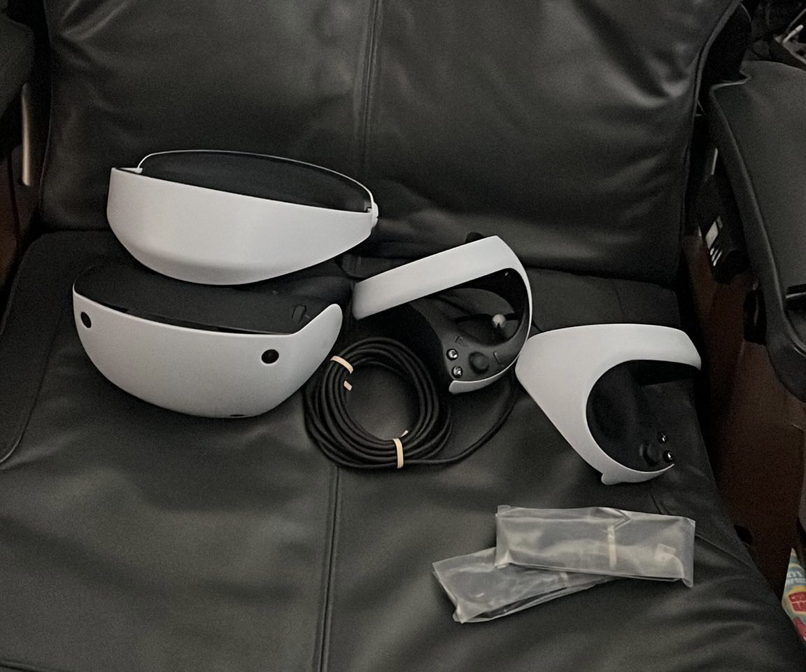 La foto mostra il visore, i due controller e il cavo di collegamento alla Playstation 5 adagiati su una poltrona da ufficio.