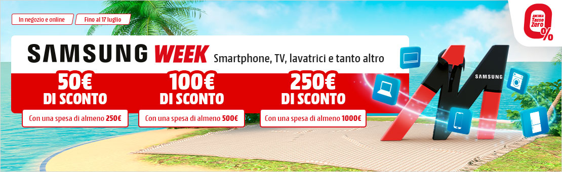 La promozione è attiva sui prodotti a marchio Samsung. SONO ESCLUSI dalla presente iniziativa: tutti i prodotti che partecipano alla promozione “LA CUCINA DEI TUOI SOGNI”, tutti i prodotti che partecipano alle promozioni online “SOLO PER OGGI” e “SOLO PER IL WEEKEND”, i prodotti ad INCASSO a marchio SAMSUNG in allegato, i prodotti ceduti nell’ambito di abbonamenti (telefonia, internet, tv ecc.), le prevendite le prenotazioni, i prodotti di editoria, i Gratta &Vinci, le polizze, le liste nozze e similari (compleanno, Cresima ecc..), e tutti quegli articoli che rappresentano pin digitali, buoni, ricariche, cofanetti, carte regalo e tutti i servizi MediaWorld.