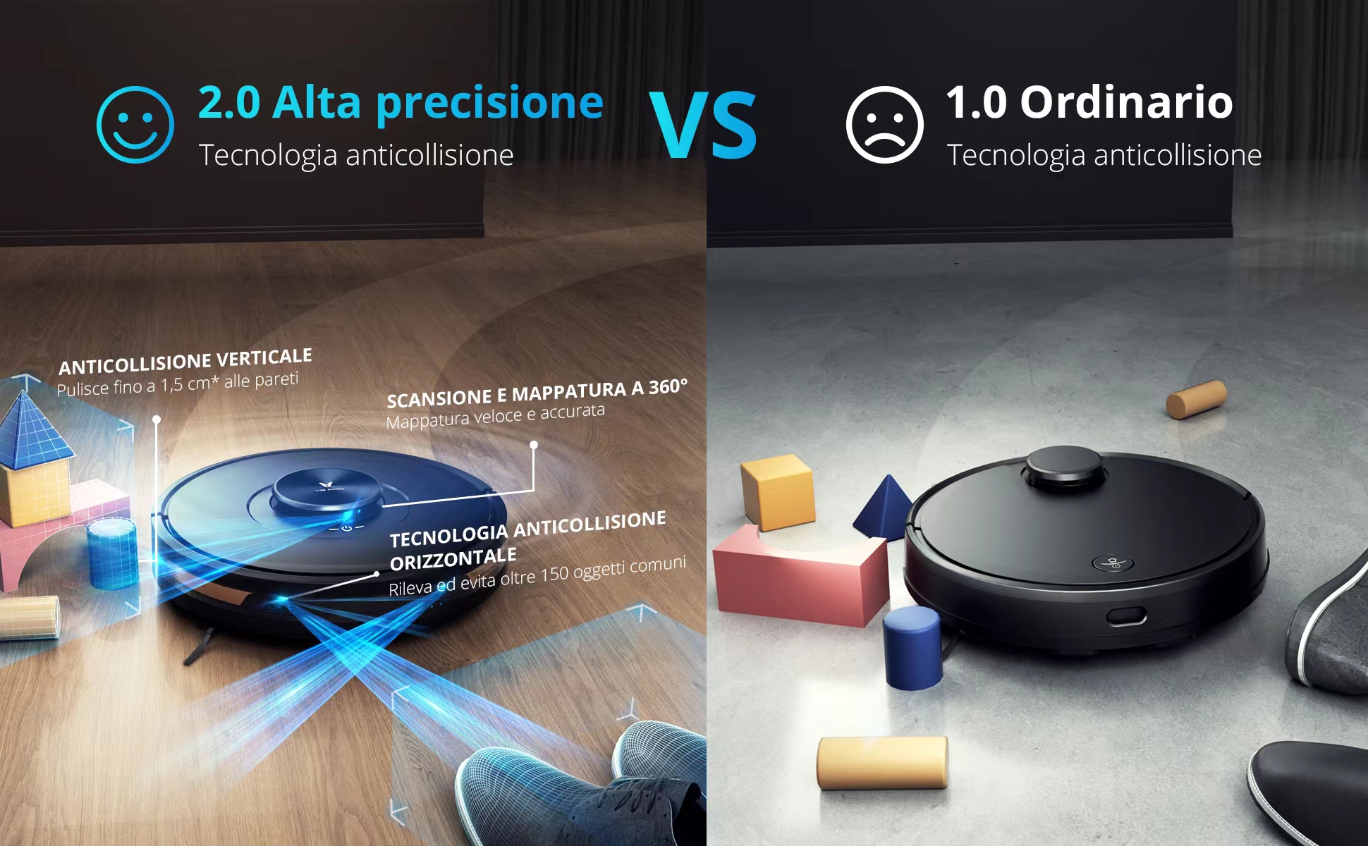 I sensori laser laterali inoltre permettono al robot di avvicinarsi all’ostacolo e di pulire a una distanza massima di 15 millimetri, così da pulire sempre al meglio, sia nei posti più disordinati sia negli angoli della casa che altri robot evitano. Il tutto senza danneggiare i mobili o far cadere oggetti preziosi.