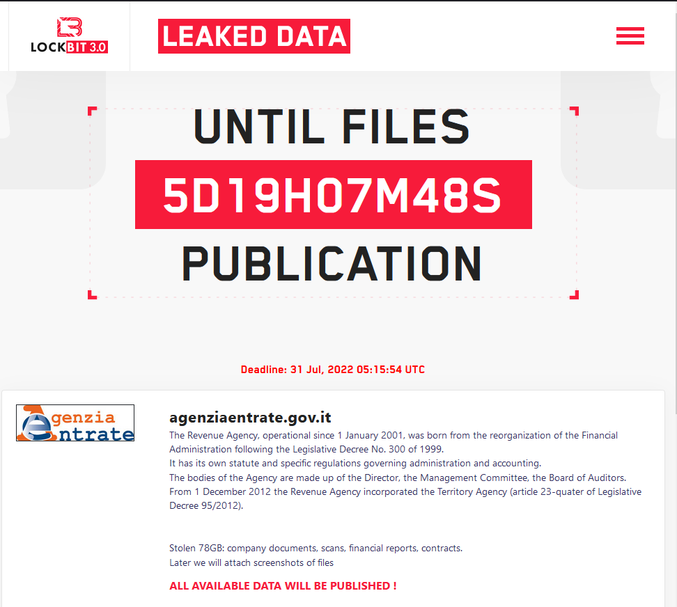 Secondo la compagnia italiana di sicurezza informatica Swascan, lo stesso gruppo di hacker LockBit avrebbe annunciato l’attacco nel dark web, dichiarando di aver rubato all’Agenzia delle Entrate 78 GB di dati.
