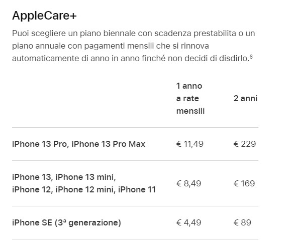 Per inciso, Apple tiene a sottolineare che con la copertura AppleCare+, ogni intervento per danno accidentale è soggetto a un costo addizionale di € 29 per i danni al display o al vetro posteriore o di € 99 per i danni accidentali di altro tipo. Ciascuna sostituzione dovuta a furto o smarrimento è soggetta a un costo addizionale di € 129. Il costo addizionale per i danni al vetro posteriore è applicabile solo per i modelli di iPhone 12 e iPhone 13.