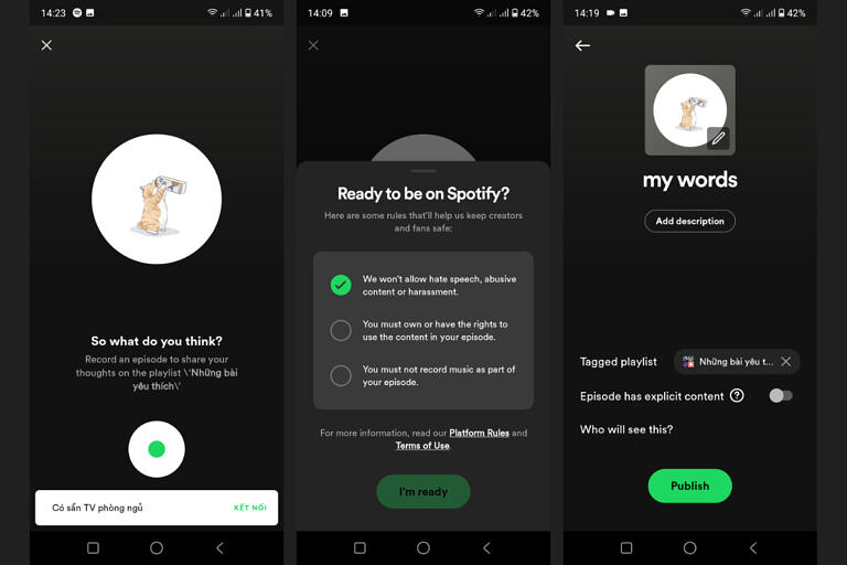 Il messaggio che offre la possibilità di pubblicare la propria reazione su Spotify come podcast appare dopo aver finito di ascoltare una playlist. Dopo aver registrato l’audio della propria reazione tramite un semplice registratore in-app è possibile apportare qualche modifica e aggiungere della musica di sottofondo e infine pubblicarla come un episodio podcast.