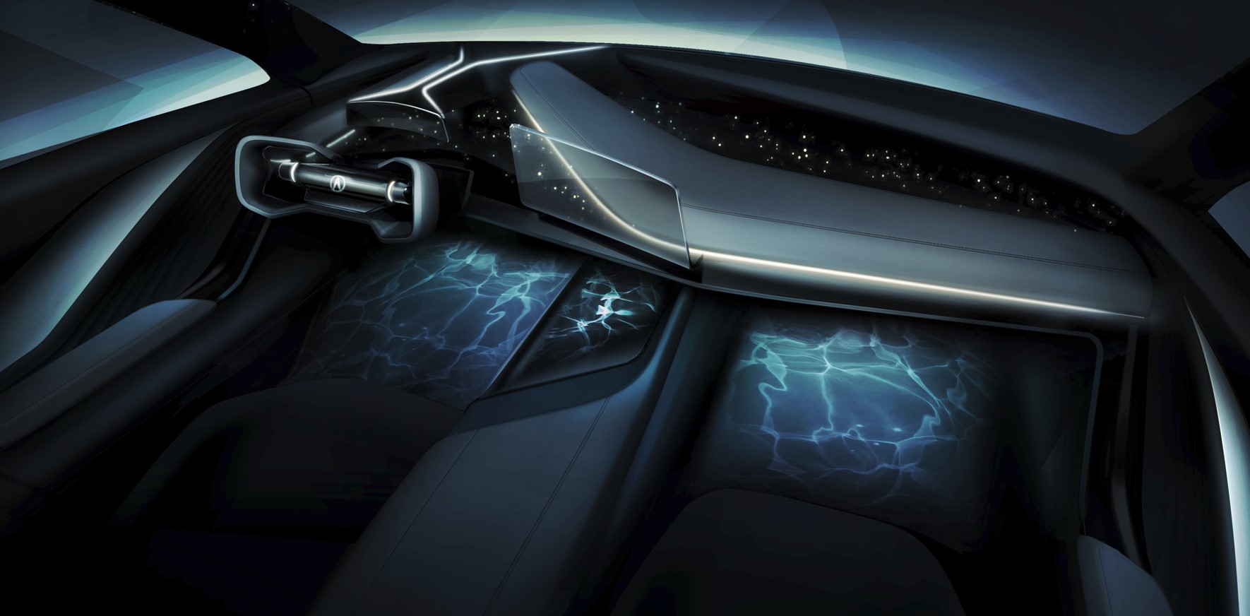 A bordo, questa Precision EV Concept di Acura si presenta con un volante piatto ispirato alle auto di Formula 1 (qualcosa di simile lo avevamo visto proprio ieri col prototipo Skoda VISION 7S), una posizione di guida ribassata e una doppia modalità pensata da una parte per la guida, dall’altra per il relax.