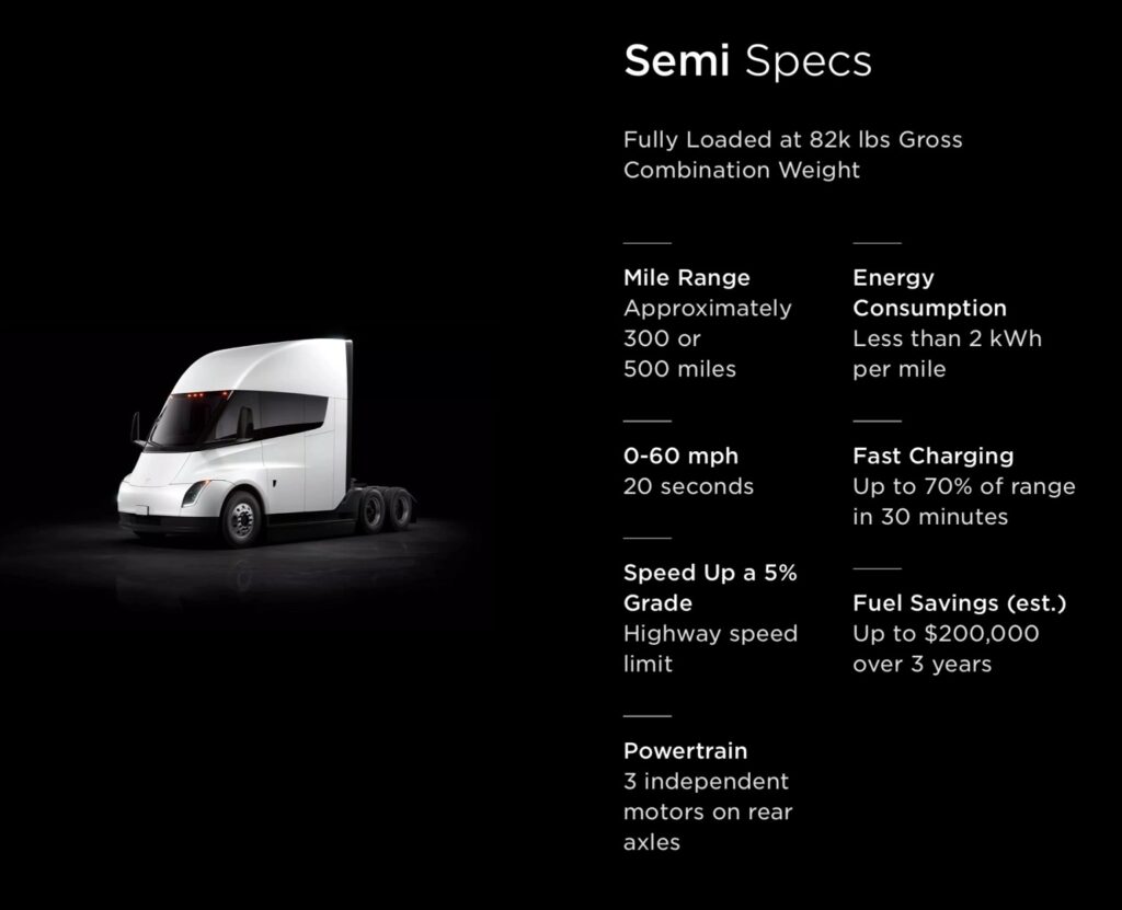Nel frattempo, Tesla ha anche aggiornato il suo sito web andando a chiarire, una volta e per tutte, le specifiche tecniche (almeno le più importanti) dell’ambizioso progetto che punta a rendere a zero emissioni il trasporto di merci sulle strade americane puntando sulle conoscenze dell’azienda nel settore delle auto elettriche e su alcune tecnologie esclusive in grado di differenziare il progetto rispetto alla concorrenza.