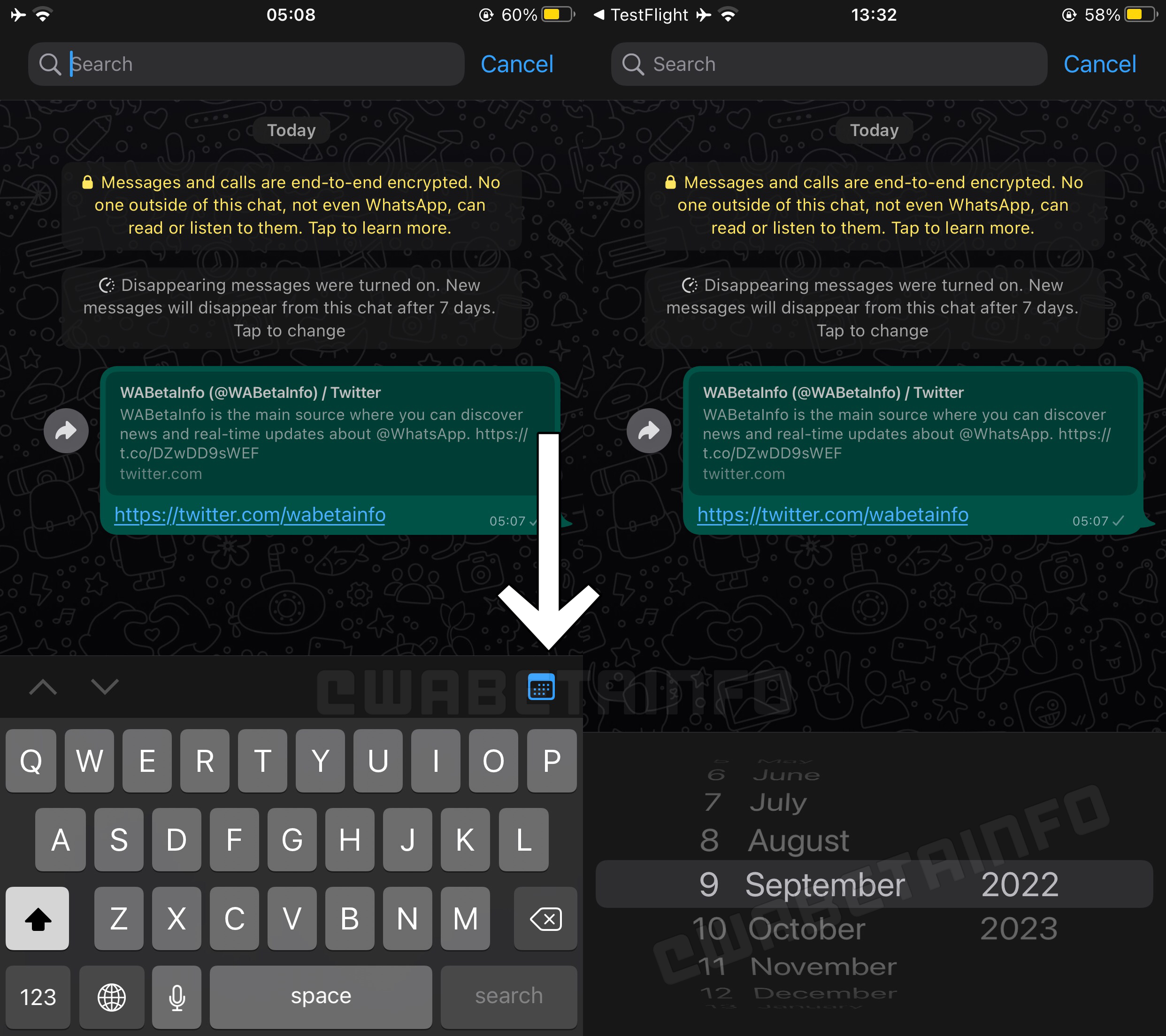In pratica, gli utenti visualizzeranno una nuova icona del calendario durante la ricerca di un messaggio in una conversazione e grazie ad essa sarà possibile saltare rapidamente a una determinata data, in modo da poter iniziare a leggere tutti i messaggi a partire da quel quel giorno esatto.