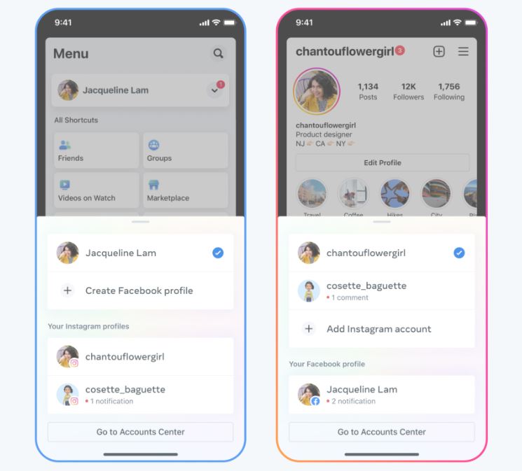 Gli utenti potranno passare facilmente tra i loro profili Facebook e Instagram se li hanno aggiunti allo stesso Account Center, visualizzando i relativi profili in un unico posto, oltre che le notifiche, con la possibilità di restare aggiornati sulle novità di entrambi i social.