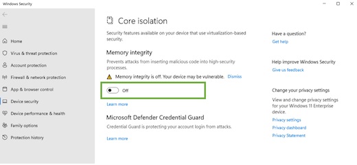 Per disabilitare l’integrità della memoria è necessario digitare “Isolamento Core” nella barra delle applicazioni e cliccare sul risultato in modo da aprire l’app di sicurezza di Windows e disattivare l’integrità della memoria.