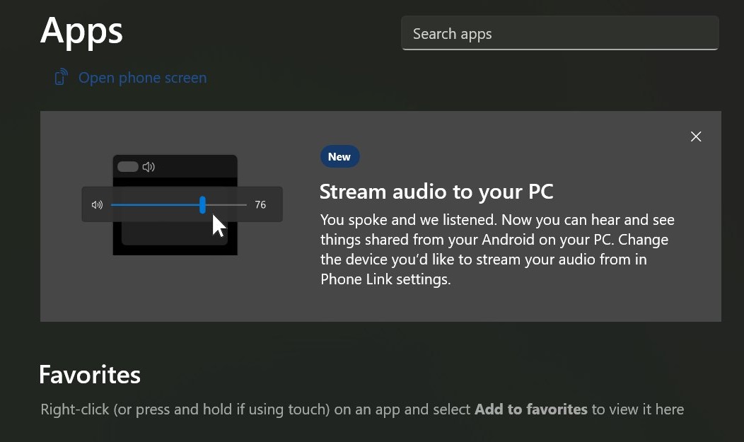 La prima novità da segnalare è una funzione denominata “Stream audio to your PC” e — come il nome lascia facilmente intuire — sfrutta Collegamento al telefono per consentire all’utente di condividere contenuti audio dallo smartphone al PC, ricordando per certi versi la funzione Connect di Spotify.