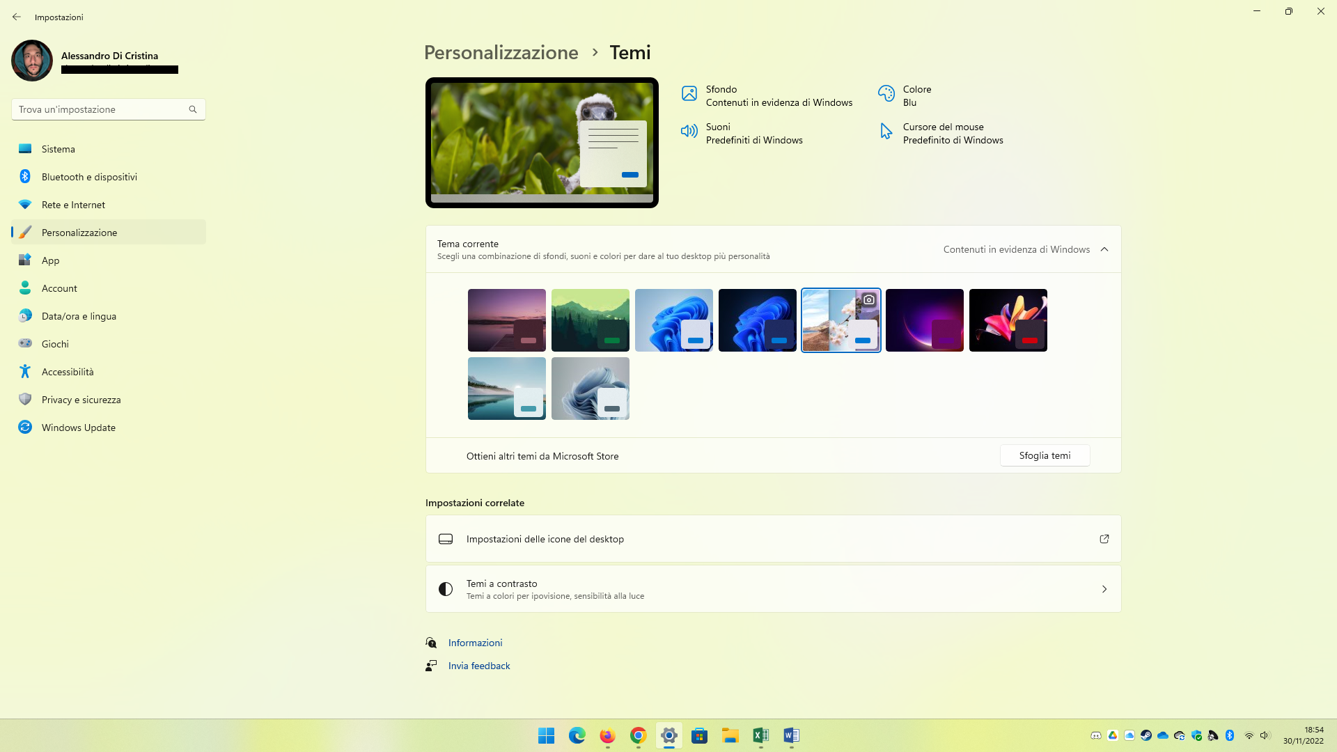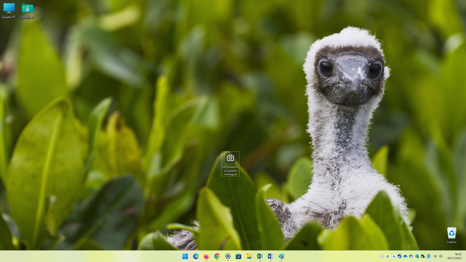 Seguendo il percorso “Impostazioni > Personalizzazione > Temi”, è possibile trovare il nuovo tema “Contenuti in evidenza di Windows, immagini dinamiche” (noto come Spotlight in lingua inglese); in sostanza, questo tema combina la funzionalità Spotlight di Windows con un tema ad hoc che renderà più immediata l’attivazione delle funzionalità “In evidenza” di Windows. In soldoni, lo sfondo del computer cambierà quotidianamente e, tramite un’icona aggiuntiva che comparirà sul desktop (chiamata “Informazioni su questa immagine”), sarà possibile raggiungere una pagina che spiega il contenuto dello sfondo. I temi di questa tipologia, sono contrassegnati dall’icona di una macchina fotografica.