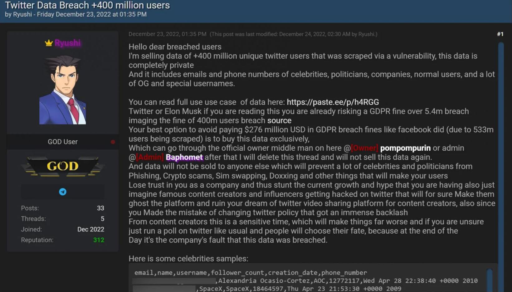 Ryushi sostiene che i dati trafugati sono stati recuperati sfruttando una vulnerabilità API di Twitter (risolta a gennaio 2022 e già usata per il furto di un altro pacchetto di dati) e invita il social network o direttamente il suo nuovo proprietario, Elon Musk, ad acquistarli prima che l’Unione Europea possa decidere di comminare una sanzione per violazione delle regole del GDPR.