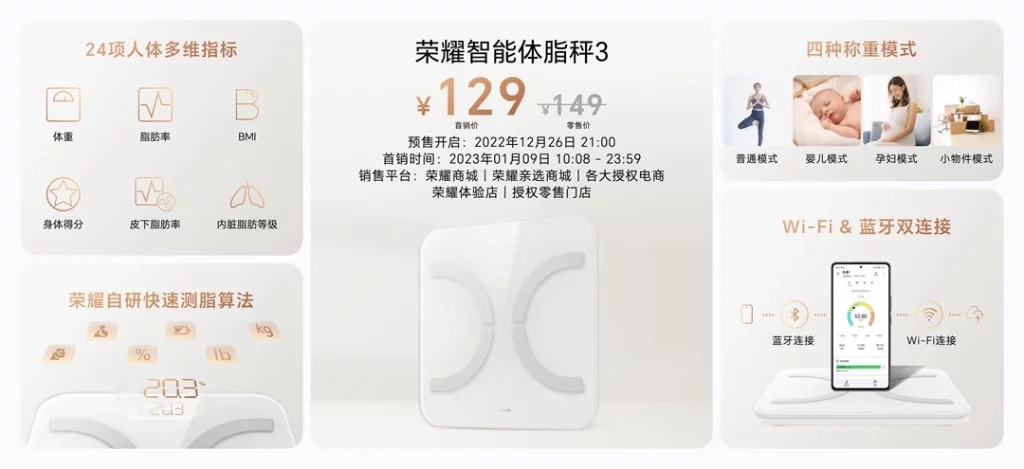 La bilancia HONOR Smart Body Fat Scale 3 è proposta in Cina al prezzo di 149 yuan (circa 20 euro) ed è attualmente in preordine al prezzo di lancio di 129 yuan (circa 17 euro) con disponibilità a partire dal 9 gennaio 2023. Al momento non abbiamo indicazioni in merito a una eventuale commercializzazione del prodotto in altri mercati.