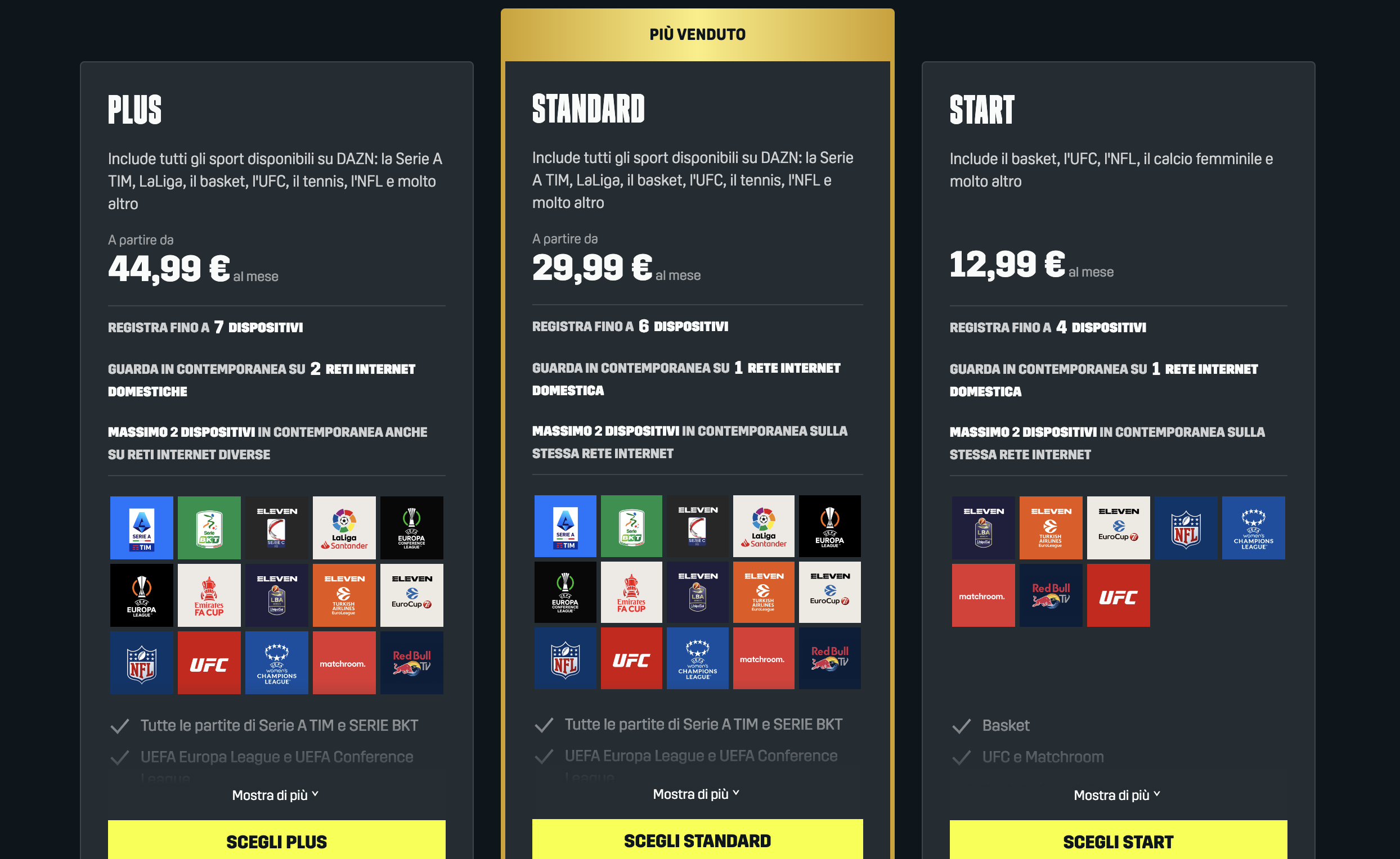- DAZN Standard è disponibile all’attivazione in versione mensile al costo più elevato di 39,99 euro e in versione annuale al solito prezzo di 29,99 euro al mese.