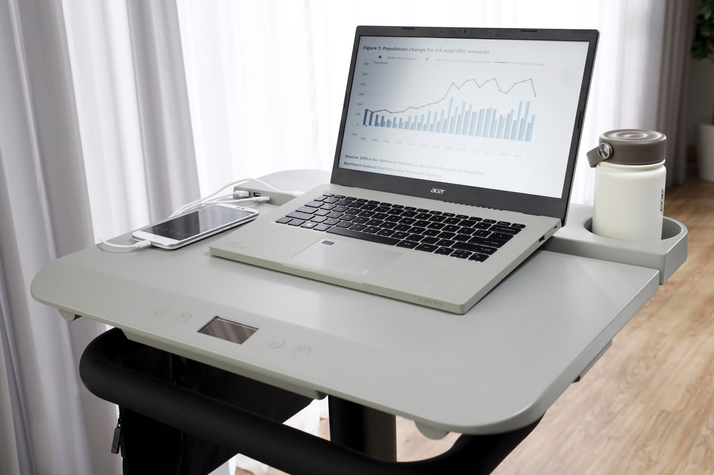 Acer l’ha presentata in occasione dell’evento annuale che si tiene a Las Vegas insieme a tanti altri prodotti, dichiarando che, un’ora di pedalata costante a 60 giri al minuto può generare 75 watt di potenza utile per ricaricare notebook, smartphone e qualsiasi altro dispositivo elettronico. Per connettere i propri dispositivi a questa scrivania-cyclette ci sono due porte USB di tipo A e una porta USB C, con tanto di indicatore di carica a LED sul retro che si illumina durante la pedalata, a segnalare che l’energia cinetica viene effettivamente convertita in energia elettrica utile.
