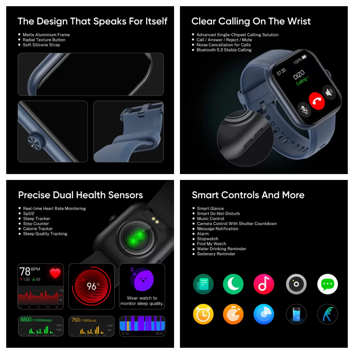 Lo smartwatch DIZO Watch D Ultra offre un display AMOLED da 1,78 pollici con risoluzione fino a 368×448 pixel e una luminosità fino a 500 nits. Lo smartwatch supporta le chiamate Bluetooth e  presenta un sofisticato design a chipset singolo che offre un consumo energetico minimo, una connessione affidabile, un algoritmo di cancellazione del rumore e funzionalità di assistente vocale tramite microfono e altoparlante integrati.