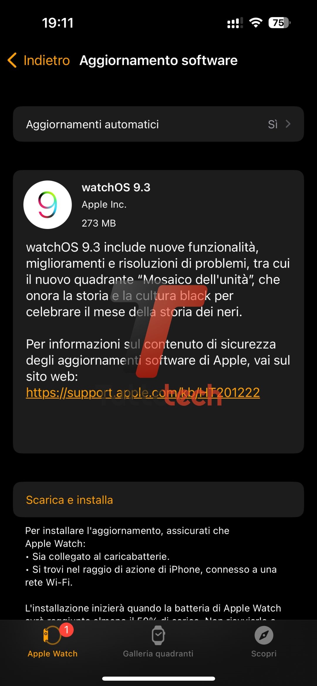- Per aggiornare Apple Watch è sufficiente aprire l’app Watch presente sul proprio iPhone e seguire il percorso “Generali > Aggiornamento software” e selezionare “Scarica e installa” quando verrà rilevata la presenza del nuovo aggiornamento; per procedere, iPhone e Apple Watch dovranno rimanere nel raggio di portata della connessione, mentre lo smartwatch dovrà avere almeno il 50% di carica ed essere mantenuto in carica.