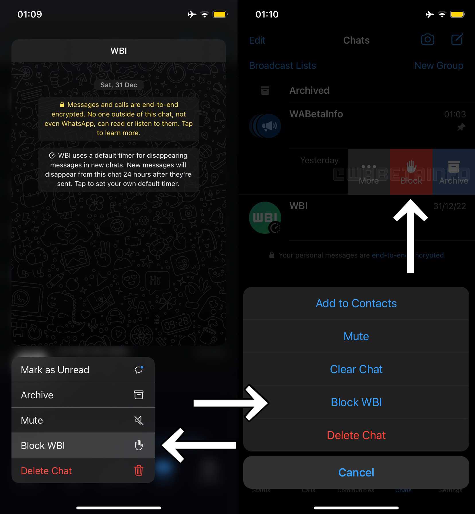 La prima scorciatoia è sempre disponibile nel menu contestuale sotto l’anteprima della chat (ovviamente solo in quelle singole) mentre la seconda è sempre disponibile all’interno delle opzioni della conversazione.
