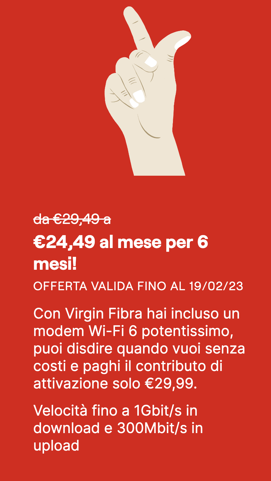 Se il prezzo e/o le prestazioni della vostra offerta telefonica di casa non vi soddisfano più e state cercando qualcosa di nuovo ed interessante per cambiare, l’operatore Virgin Fibra potrebbe avere appena lanciato la promozione giusta per voi: a partire da oggi, 6 febbraio 2023, la già nota offerta Virgin Fibra Pura è disponibile all’attivazione comodamente online al prezzo scontato di 24,49 euro al mese.