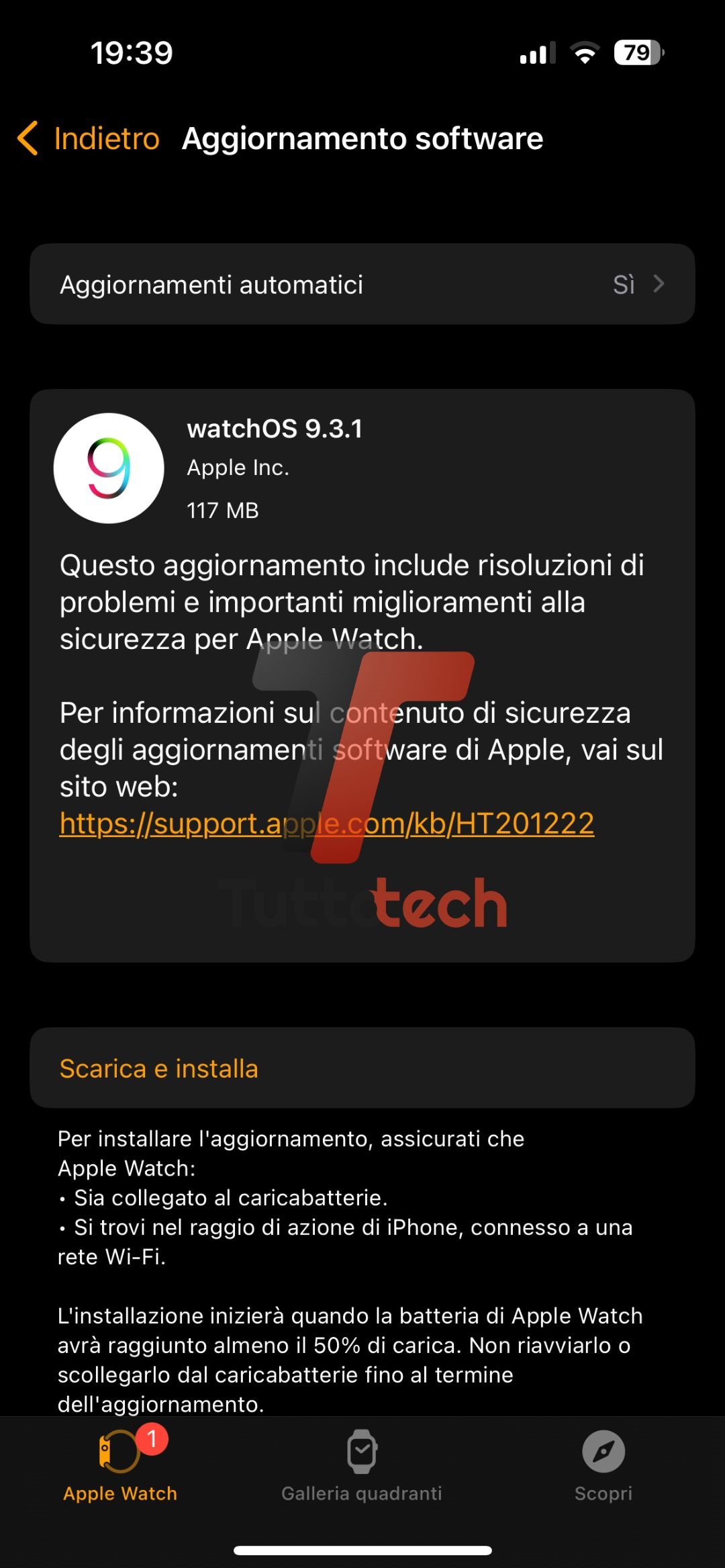 • Per aggiornare Apple Watch è sufficiente aprire l’app Watch presente sul proprio iPhone e seguire il percorso “Generali > Aggiornamento software” e selezionare “Scarica e installa” quando verrà rilevata la presenza del nuovo aggiornamento; per procedere, iPhone e Apple Watch dovranno rimanere nel raggio di portata della connessione, mentre lo smartwatch dovrà avere almeno il 50% di carica ed essere mantenuto in carica.