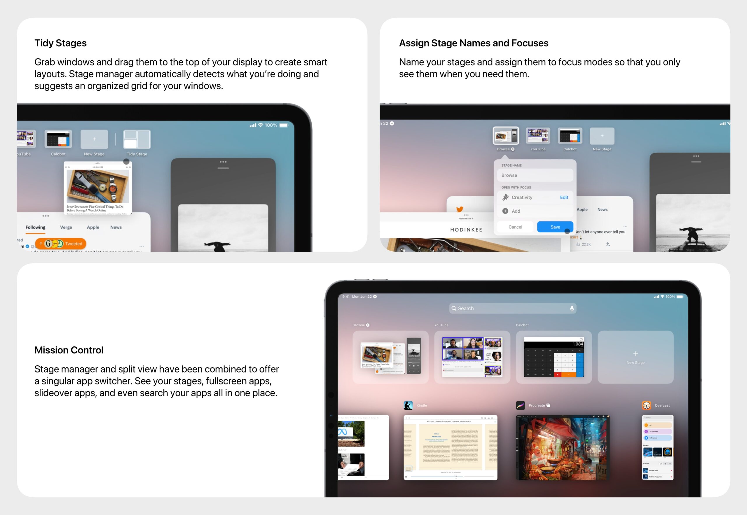 La funzionalità Stage manager, introdotta con iPadOS 16 e macOS 13 per potenziare il multitasking, è immaginata in veste ancora più potenziata.