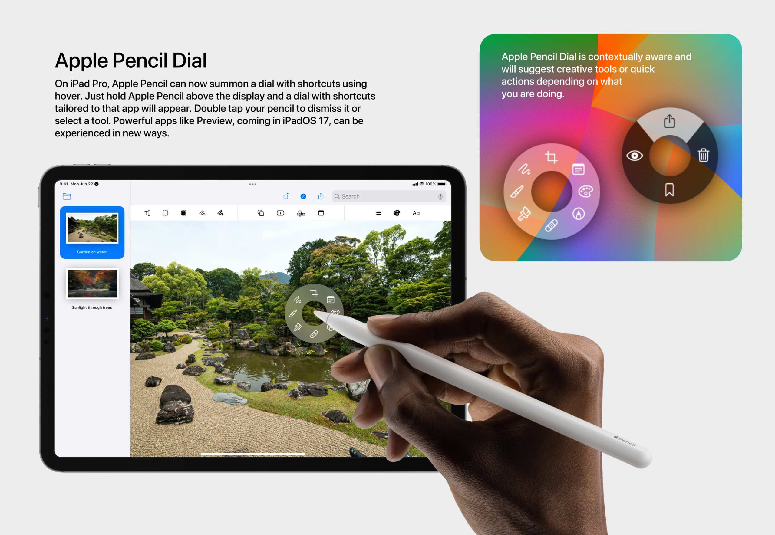 Questo “quadrante” si apre quando l’utente posiziona la Apple Pencil per puntare determinati elementi delle app, offrendo scorciatoie e l’accesso rapido agli strumenti. E in combinazione con la nuova Anteprima per iPad, consente un editing dei documenti più rapido ed efficiente.