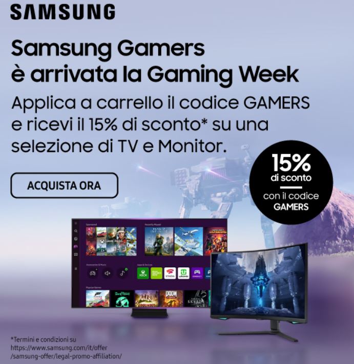 Da Samsung arriva una nuova interessante promozione dedicata agli appassionati di videogame: stiamo parlando di Gaming Week, iniziativa che permette agli utenti di usufruire di uno sconto del 15% su una selezione di Smart TV e monitor del colosso coreano.