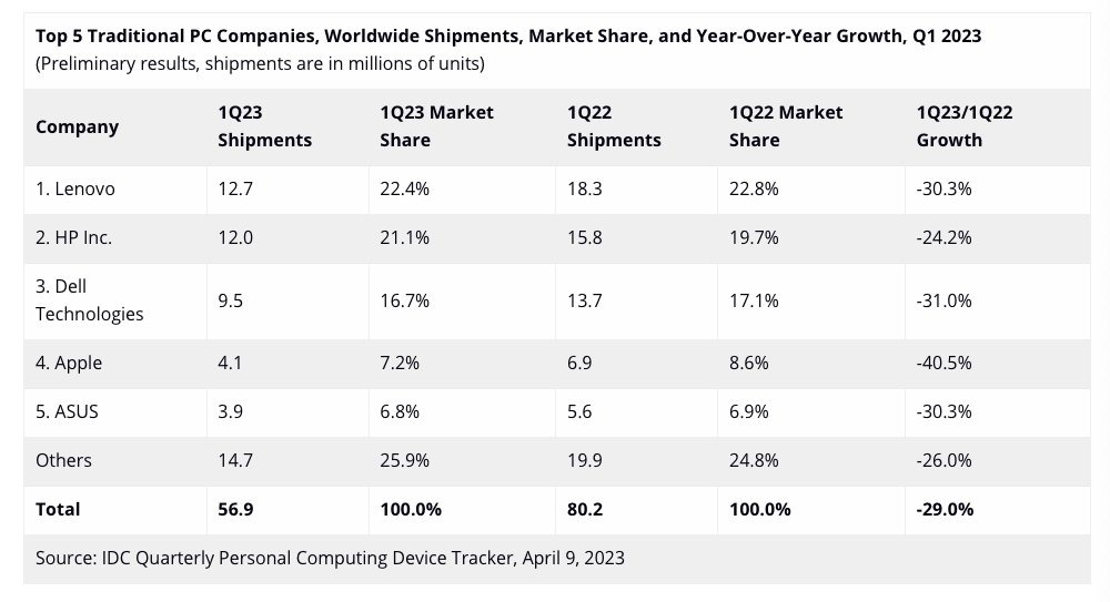 Stando a quanto condiviso, Lenovo (al primo posto) ha spedito 12,7 milioni di dispositivi nel primo trimestre del 2023, rispetto ai 18,3 milioni del primo trimestre del 2022, registrando un calo del 30,3%; l’azienda che occupa il secondo posto invece, HP, ha registrato il calo minore fermandosi al 24,2%.