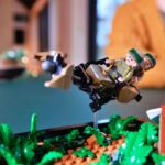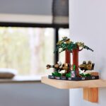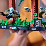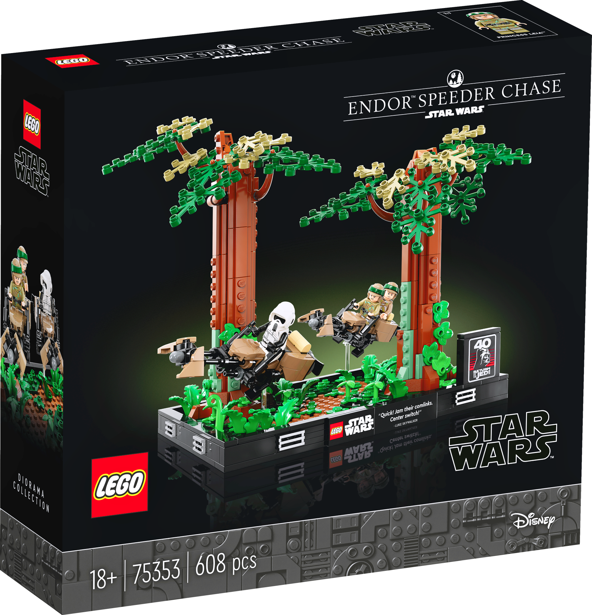 Non meno avvincente è il secondo diorama, realizzato con 608 pezzi, che riproduce l’inseguimento su Endor tra lo speeder su cui viaggiano Luke Skywalker e la principessa Leia e uno su cui trova posto uno Scout Trooper. Ogni elemento, dal verde del terreno alle cime degli alberi è riprodotto, non manca anche un mattoncino celebrativo che ricorda il quarantesimo anniversario del film.