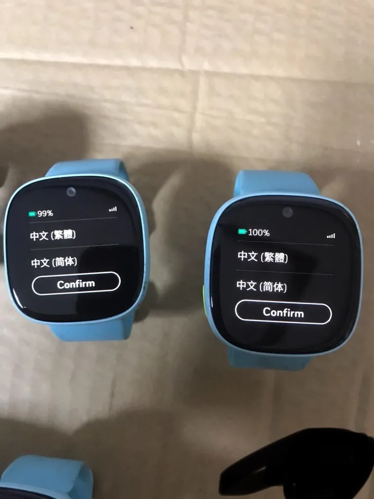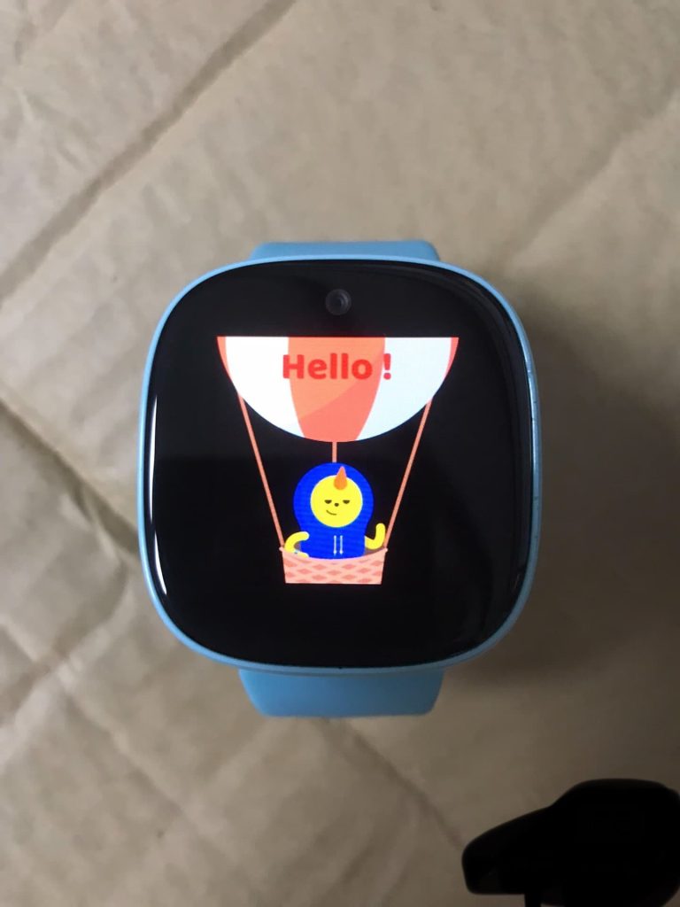 Le foto mostrano che all’accensione questo smartwatch Fitbit per bambini visualizza il logo dell’azienda e una stravagante schermata di benvenuto, mentre il processo di configurazione offre un selettore della lingua con la percentuale di carica della batteria e l’intensità della rete mobile visibili in alto.