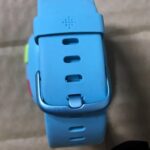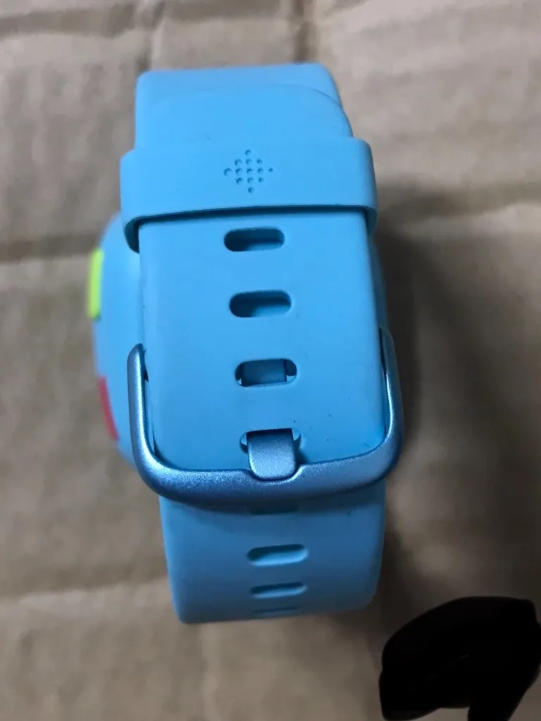 Frontalmente è visibile una fotocamera in alto, mentre lungo il lato sinistro si possono notare due pulsanti colorati, tra i quali è visibile un foro che potrebbe essere per il microfono. Il colore azzurro della cassa si estende al cinturino che sembra essere rimovibile e presenta il logo Fitbit.