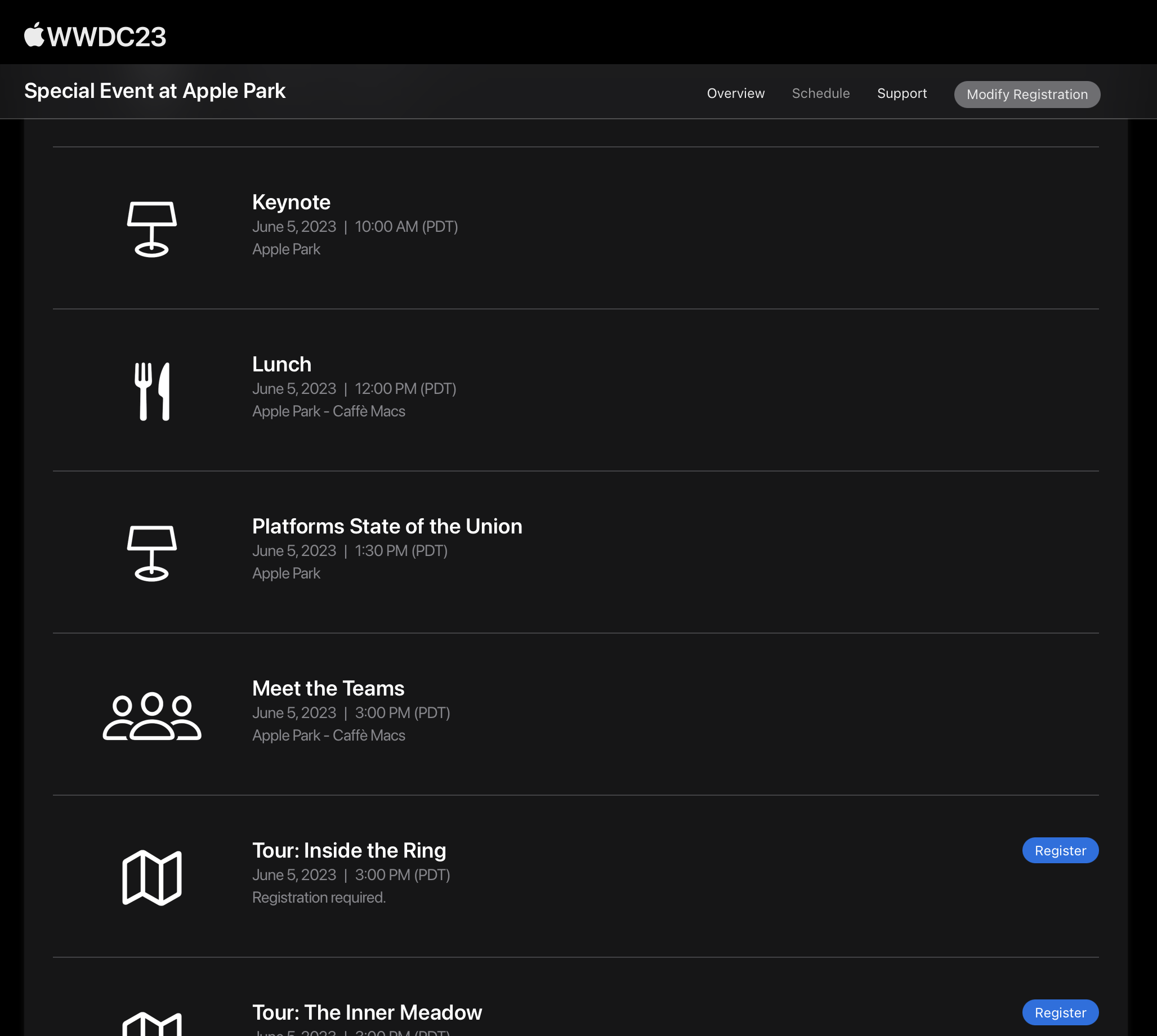 Stando a quanto condiviso dallo sviluppatore Paul Hudson tramite il proprio account sul social network Mastodon, Apple ha annunciato il programma degli “Special Event at Apple Park”, la serie di eventi della WWDC23 a cui potranno partecipare, in presenza, pochi fortunati.