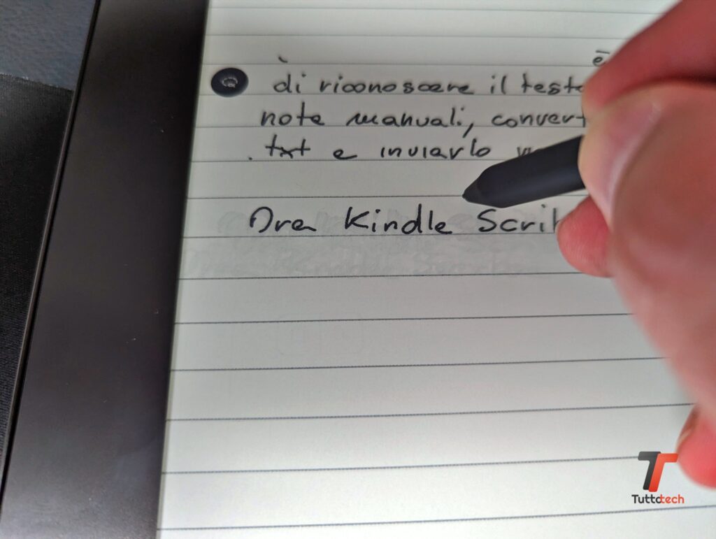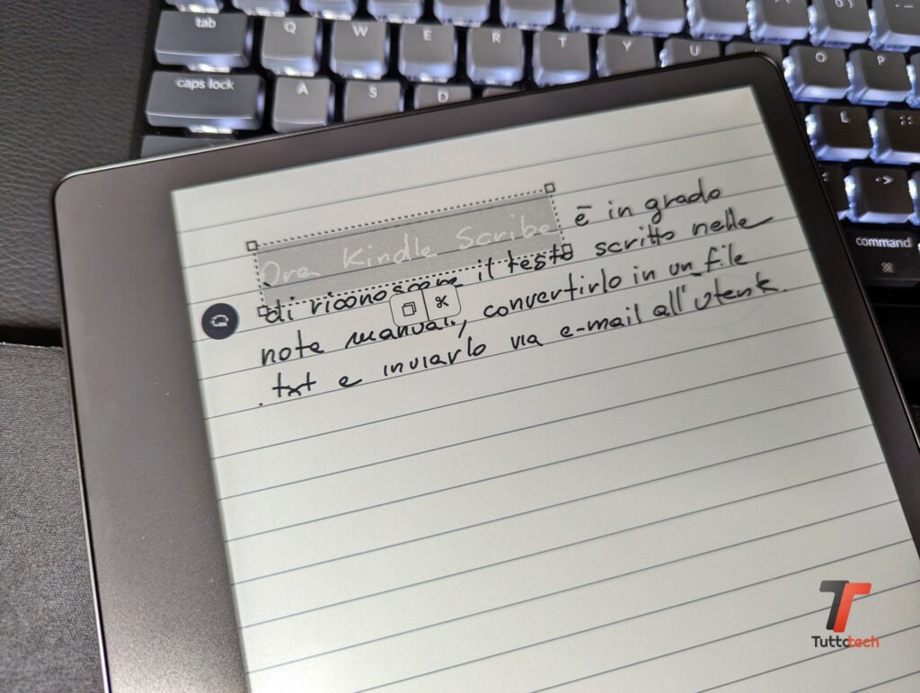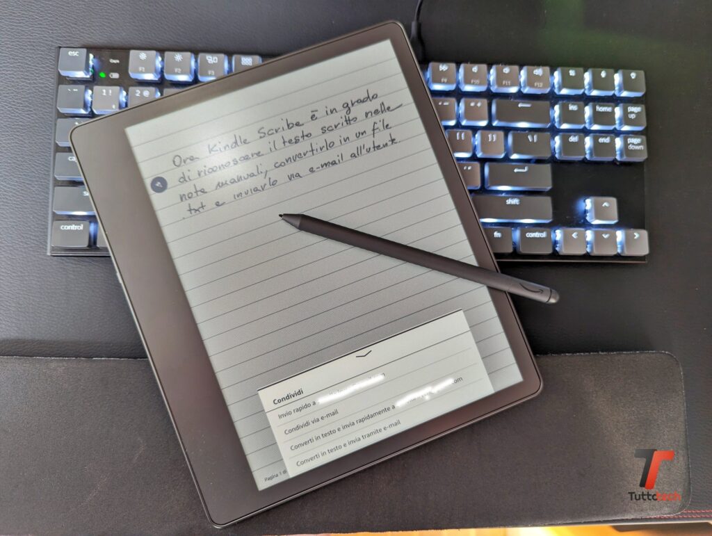 Partiamo dalla funzione di conversione del testo scritto a mano, per alcuni versi la più utile e interessante fra queste novità di Kindle Scribe (qui per la recensione completa). Come intuibile permette di digitalizzare (come file .txt) i propri appunti scritti con la penna, affinché li si possa esportare, modificare e condividere più facilmente tramite e-mail, con un massimo di 5 indirizzi diversi. Ecco come si presenta la funzione.