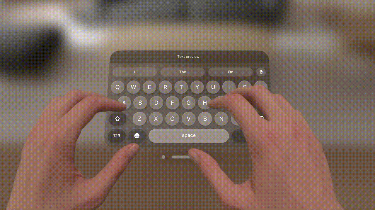 Nella demo Apple ha sfoggiato le due modalità di digitazione di Vision Pro: una resa possibile attraverso una tastiera virtuale posta frontalmente mentre l’altro si avvale di una tastiera reale sulla quale vengono posti elementi virtuali come il campo di testo e la predizione delle parole; il tutto inserito nel proprio ambiente circostante grazie alla realtà aumentata.