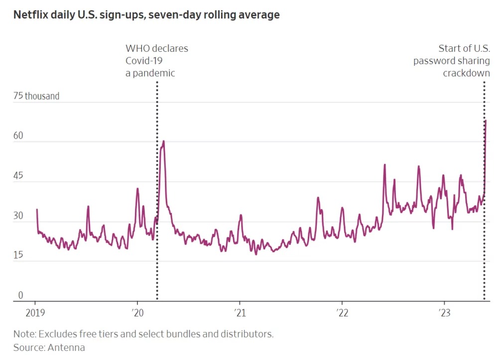 Nonostante i primi abbandoni di qualche mese fa, secondo i dati condivisi dalla società di analisi Antenna, negli Stati Uniti Netflix ha registrato un notevole aumento dei nuovi abbonati in seguito al blocco della condivisione delle password; diamo insieme un’occhiata.