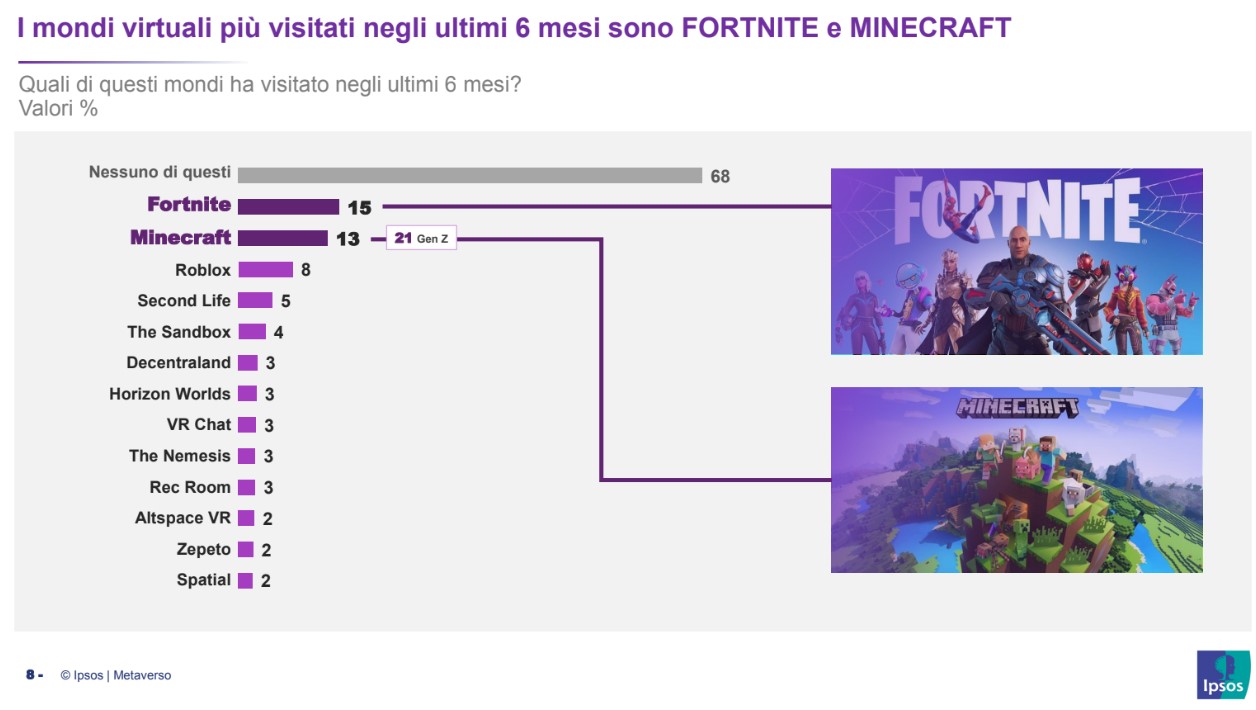Fra queste attività, si evince che il 32% del campione ne ha svolte più di cinque diverse fra cui giocare o trascorrere del tempo con amici per il 33% e acquistare oggetti reali o esplorare città per il 30%. Non sorprende ci sia poi Fortnite in cima ai mondi virtuali più visitati degli ultimi 6 mesi, seguito da Minecraft, Roblox, Second Life e The Sandbox, rispettivamente per il 15, 13, 8, 5 e 4%; non ha visitato alcunché il 68%, mentre il restante comprende Decentraland, Horizon Worlds, The Nemesis e altri.