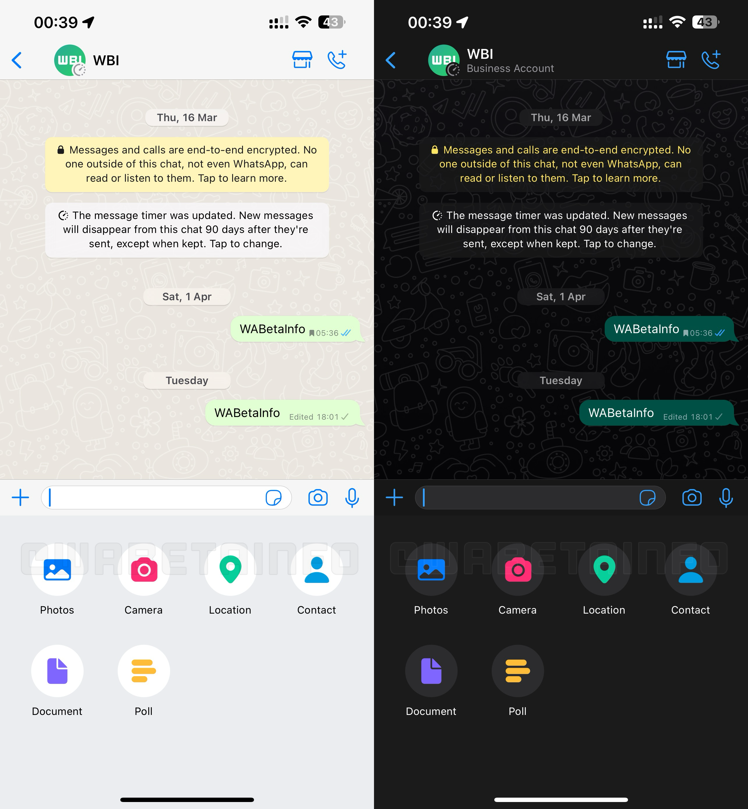 Così come viene mostrato da questi screenshot, gli sviluppatori si sono impegnati per migliorare il menu degli allegati della chat sia per il tema chiaro che per quello scuro.