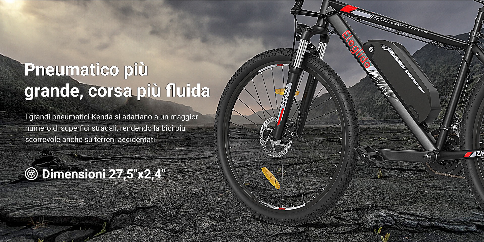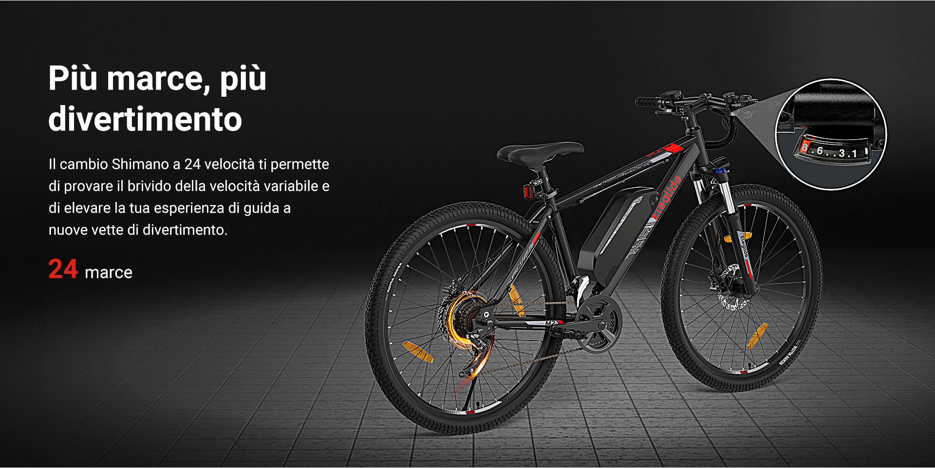 Il cambio di ELEGLIDE M2 è prodotto da Shimano e può contare su ben 24 diversi rapporti, con una tripla corona all’anteriore e un pacco pignoni da 8 elementi al posteriore. In questo modo sarà facile mantenere sempre una pedalata agile su ogni terreno, salite comprese. Le ruote da 27,5 x 2,4 pollici sono perfette per qualsiasi fondo stradale, anche i più sconnessi, e rendono la bici molto scorrevole anche per quanto riguarda i terreni più accidentati.
