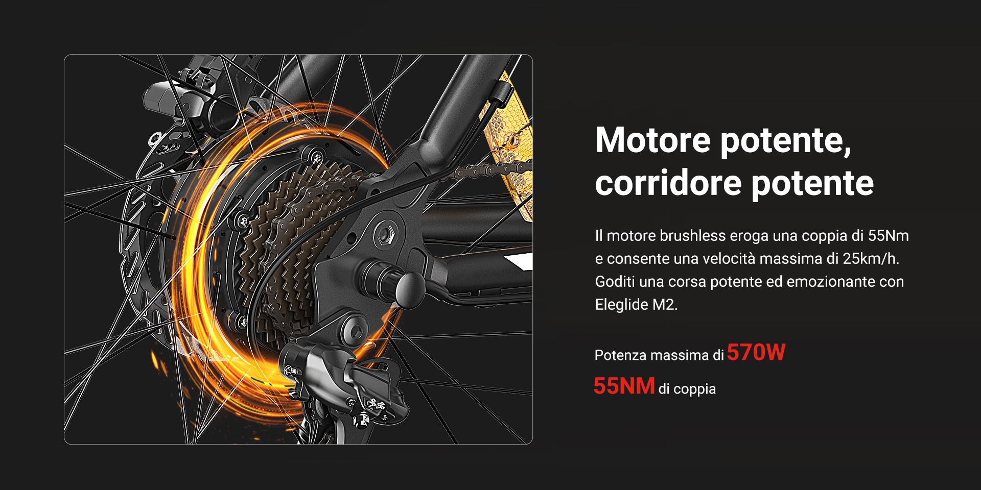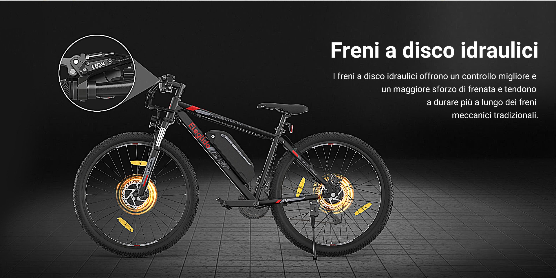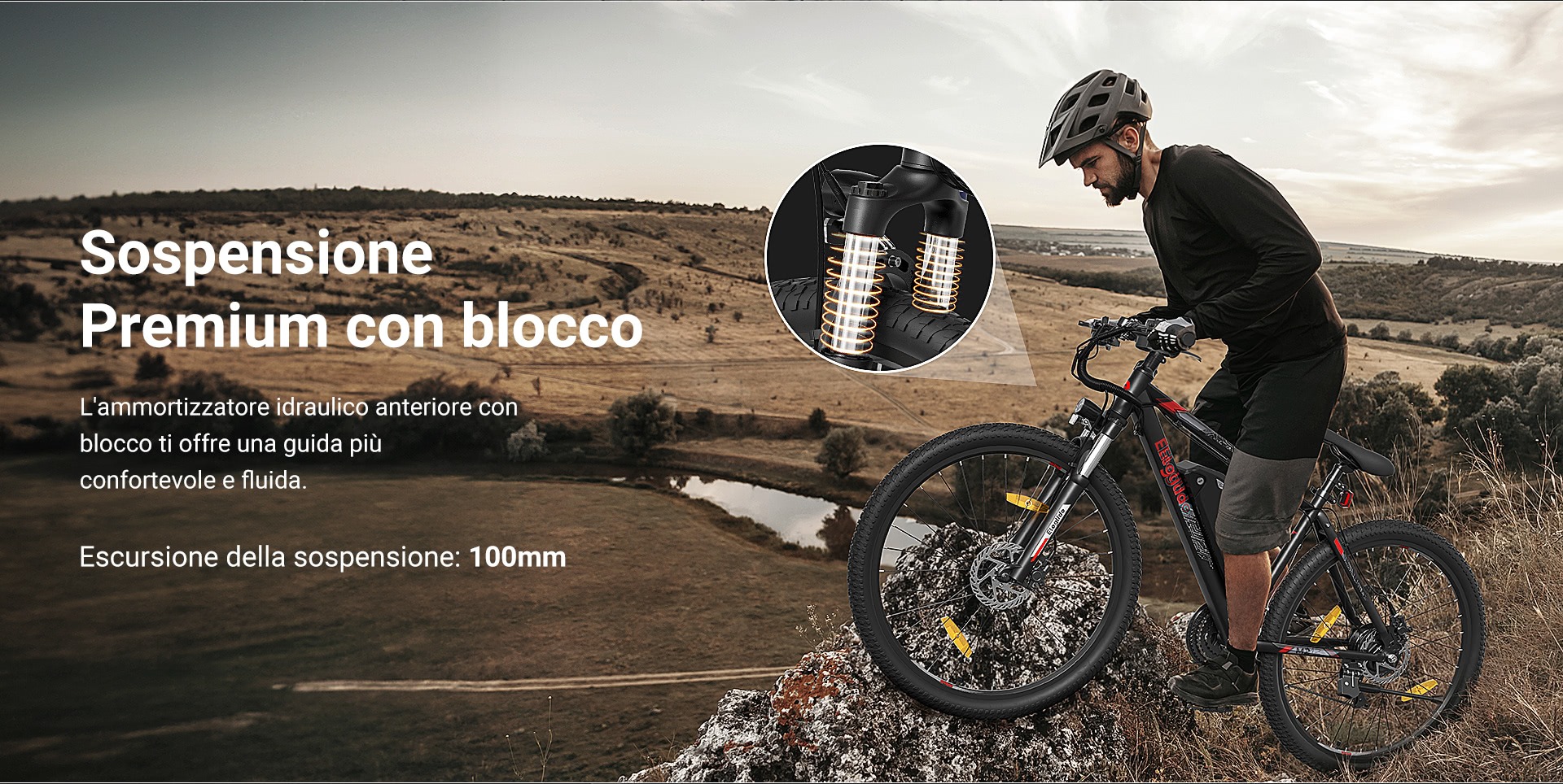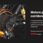 Il motore, che spinge fino a un massimo di 25 Km/h, ha una potenza massima di 570 watt e una coppia di 55 Nm, risultando ideale quindi anche per i percorsi più accidentati. A questo proposito va sottolineata la presenza di una sospensione idraulica, con escursione di 100 millimetri e possibilità di bloccare, una funzione molto utile soprattutto in salita.